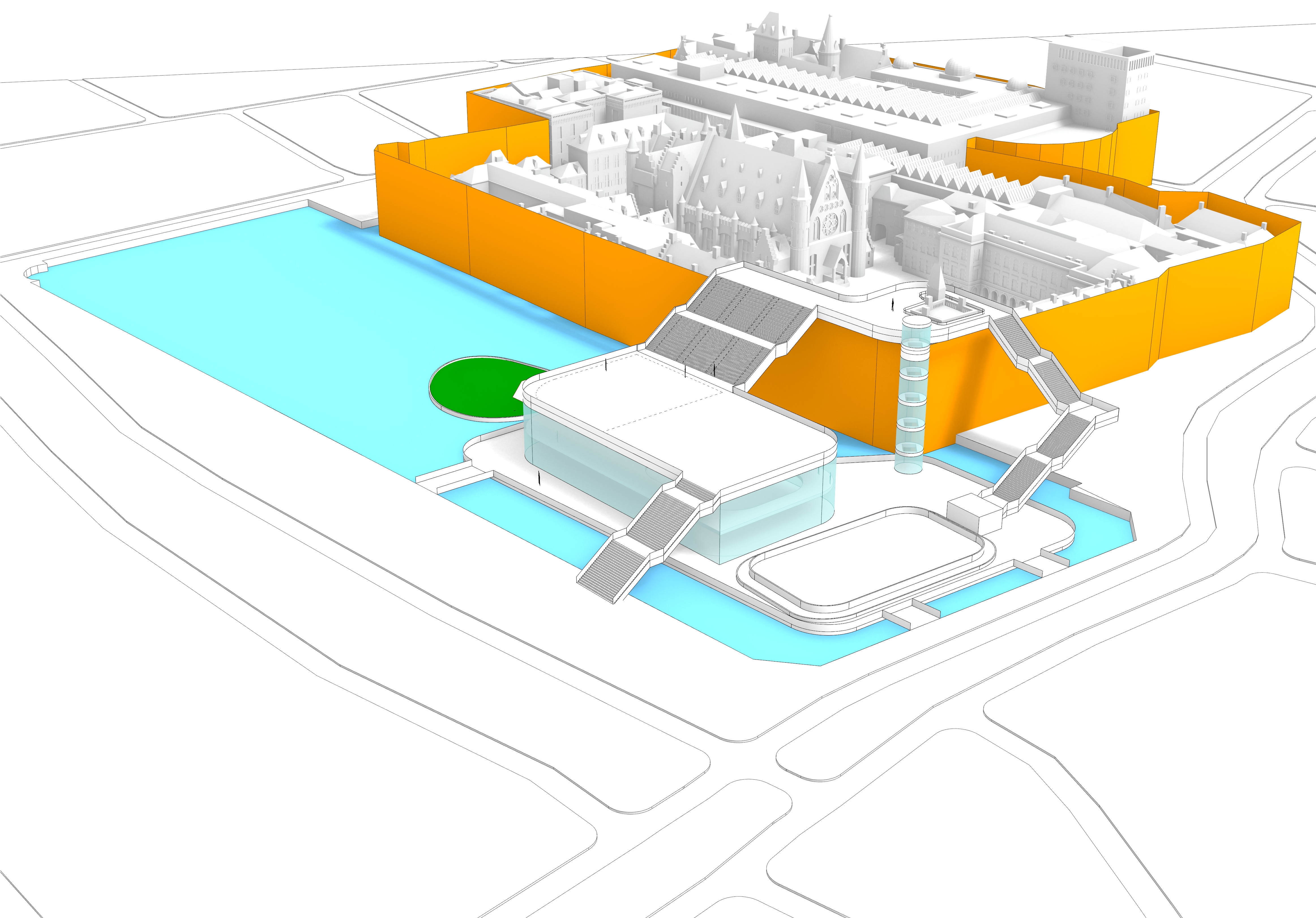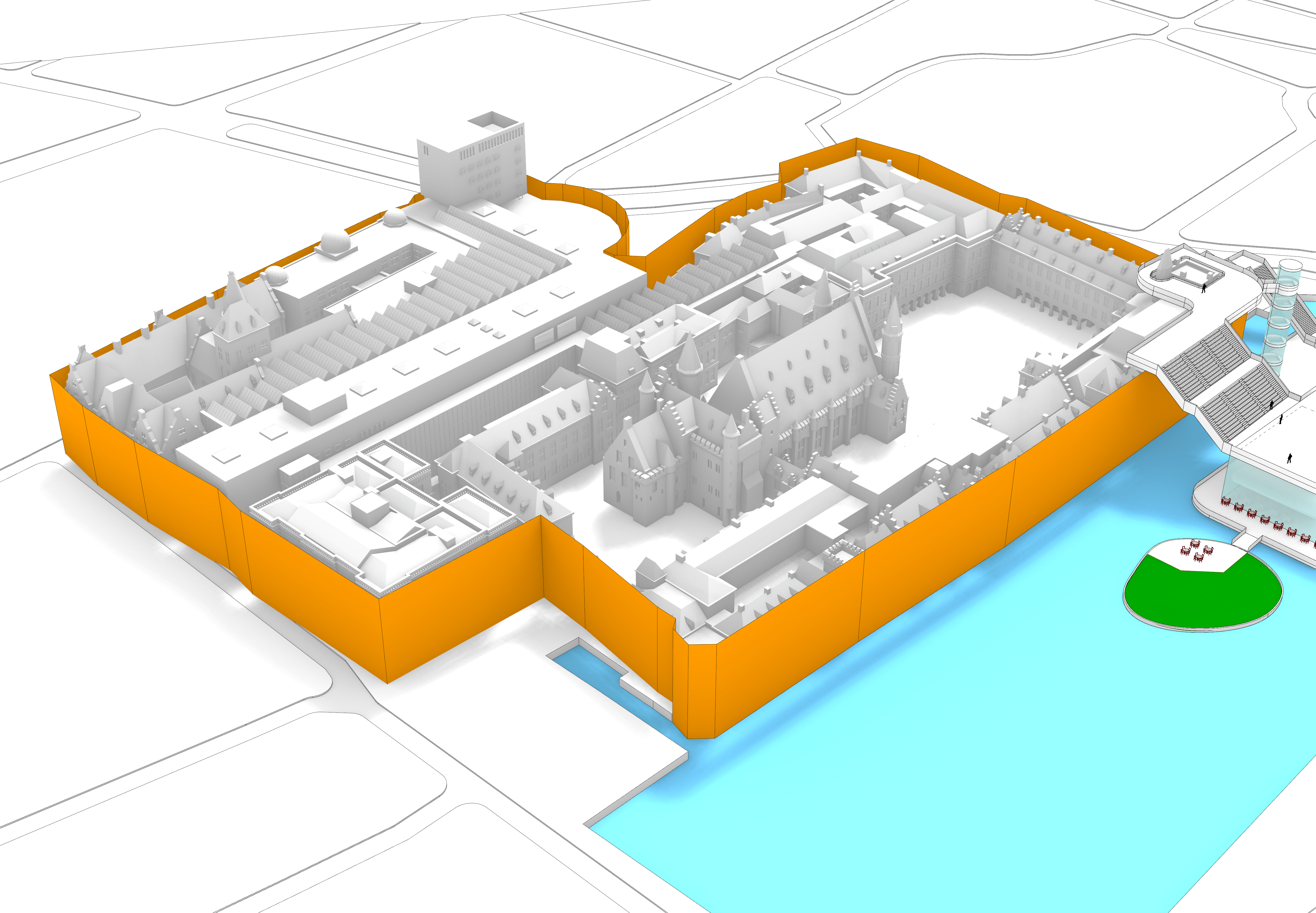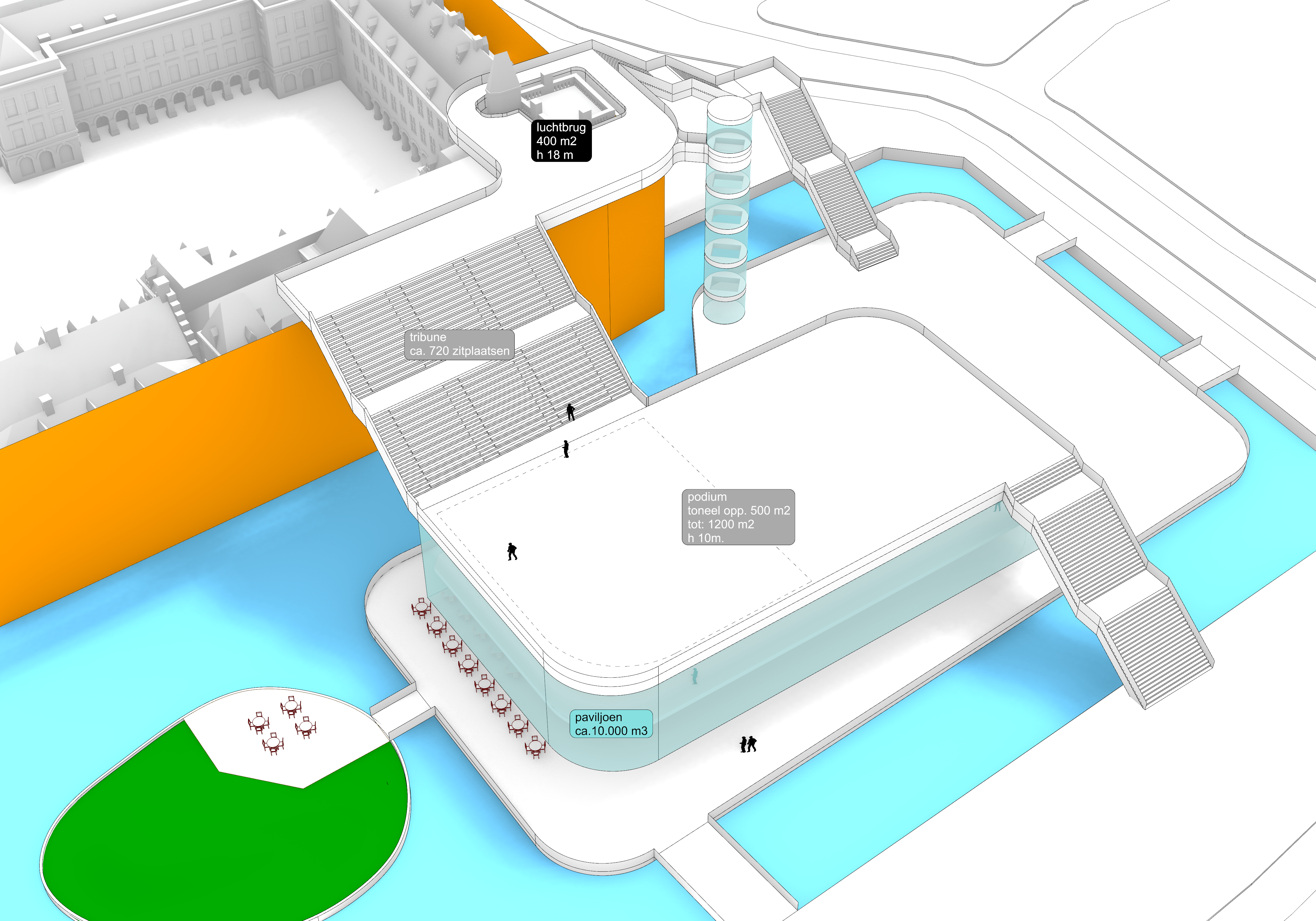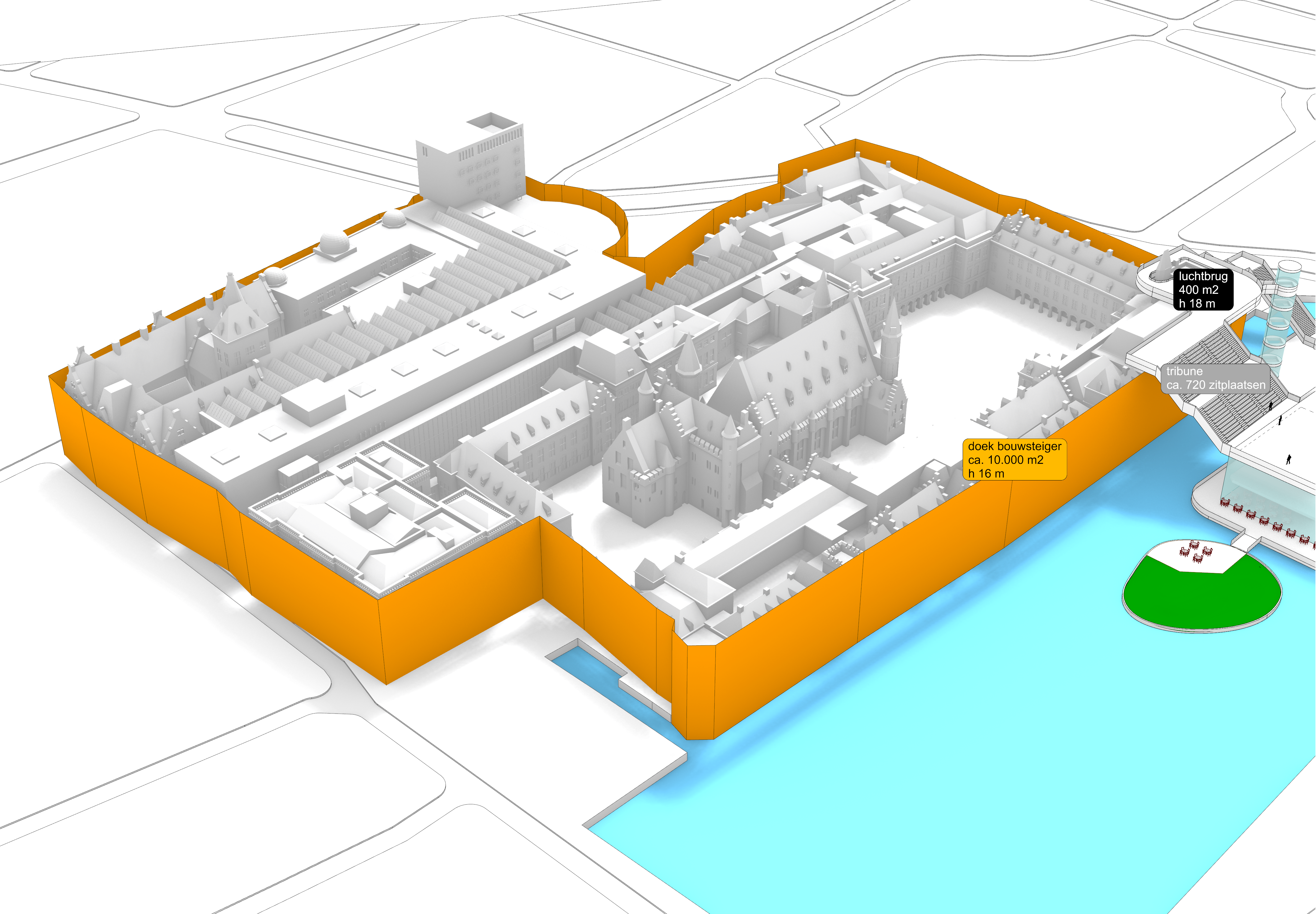 De kern is simpel: maak van de tijdelijke bouwomgeving rond het Binnenhof in Den Haag een levendige bestemming. Een belangrijk onderdeel is een iconisch paviljoen op de Hofvijver, ontworpen in samenwerking met Studio MAUC en Marcel Wanders. Dat paviljoen is bedacht als informatiepunt, tentoonstellingsruimte, evenementenlocatie en VIP-ontvangst, met een uitstraling die tegelijk statig en eigentijds voelt. Het zou tijdelijk ook een paar representatieve functies van het Binnenhof kunnen overnemen.
