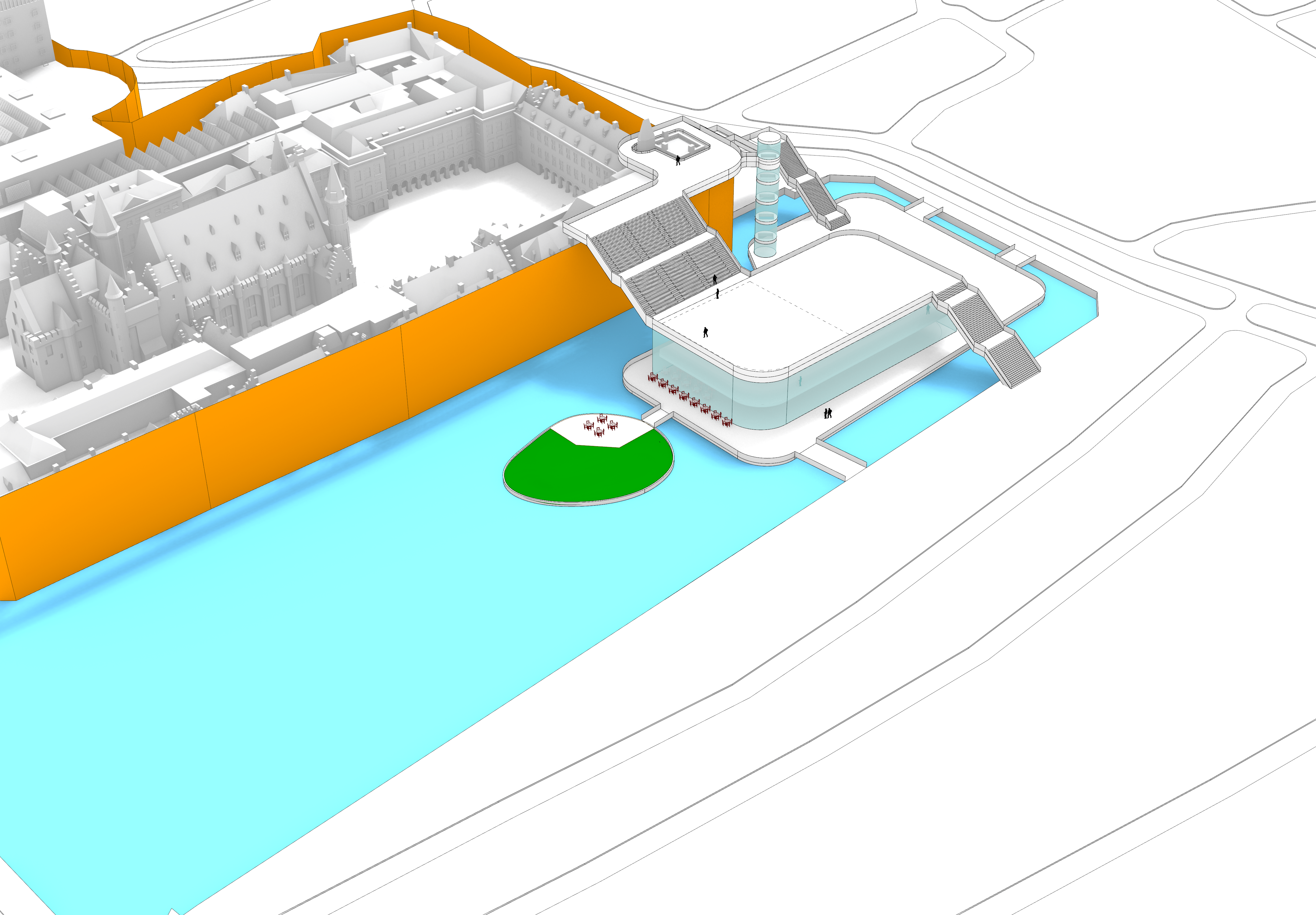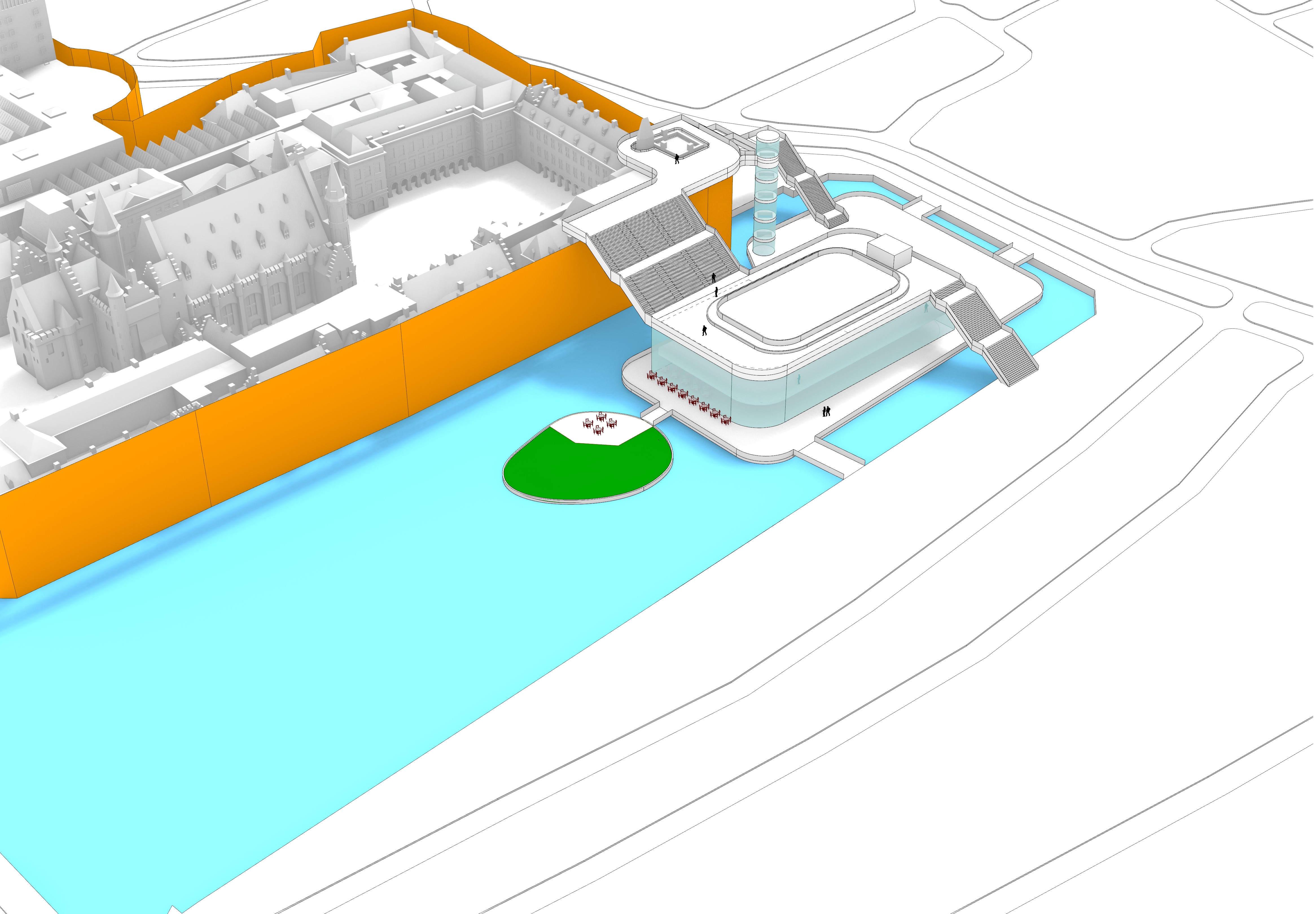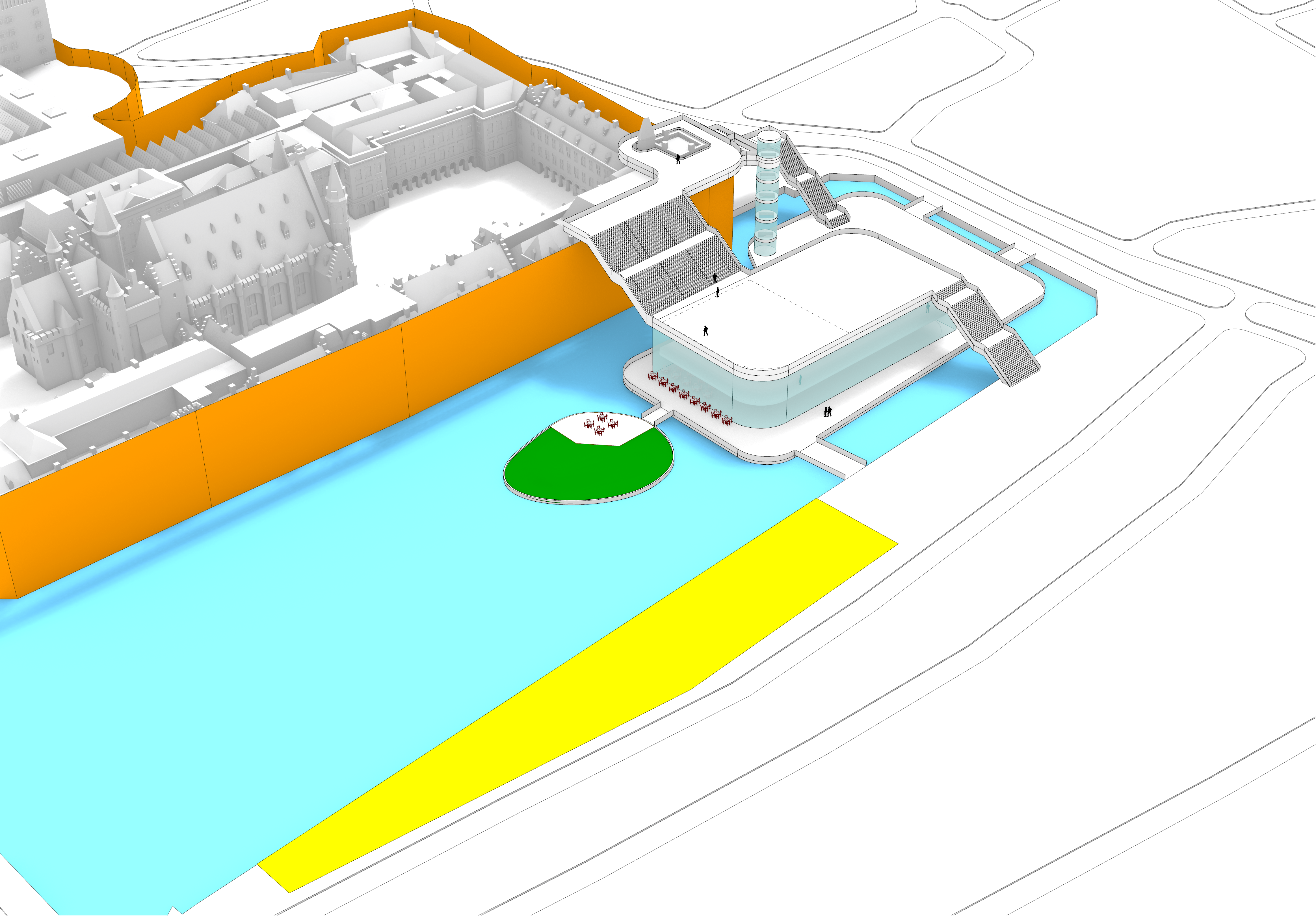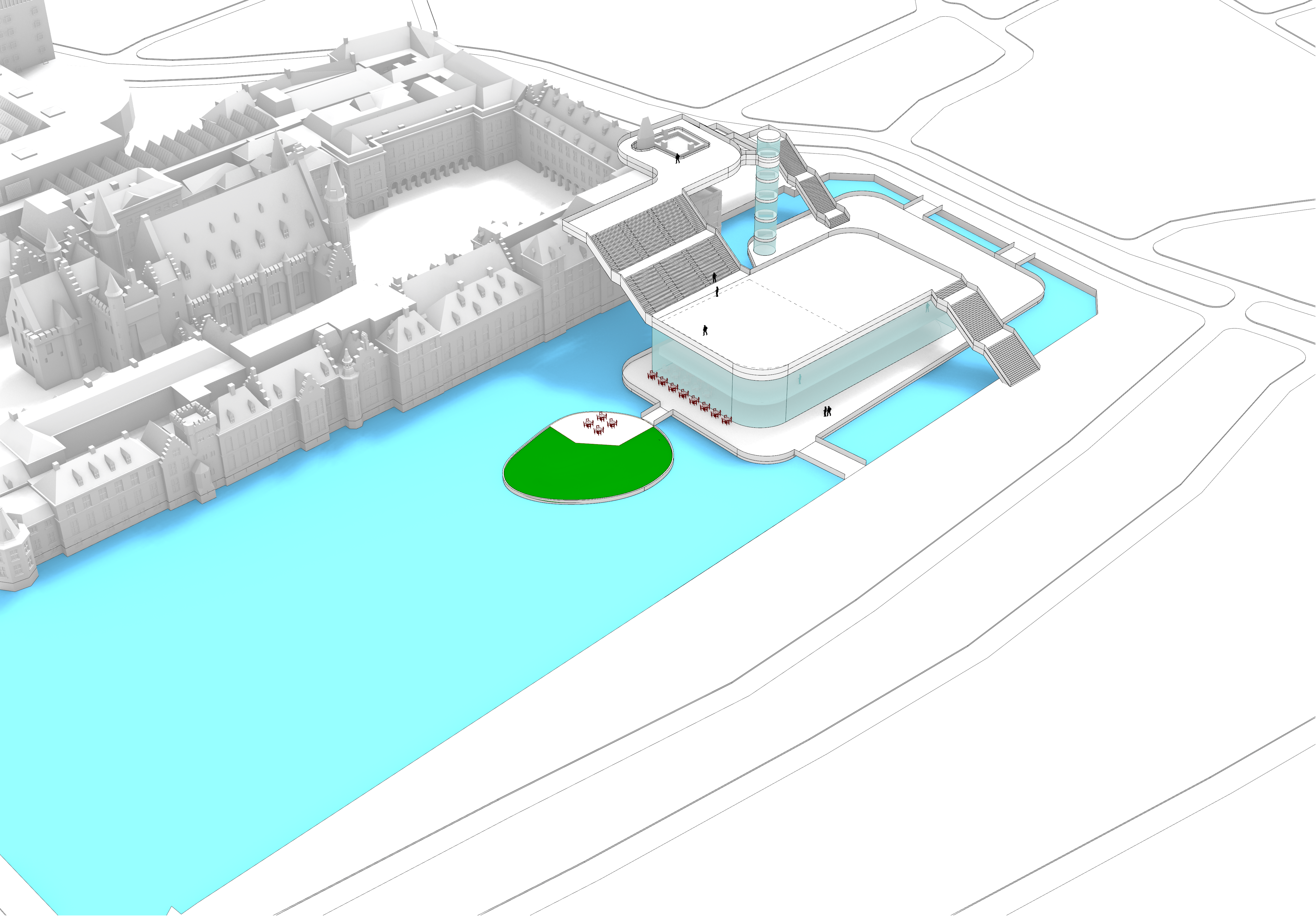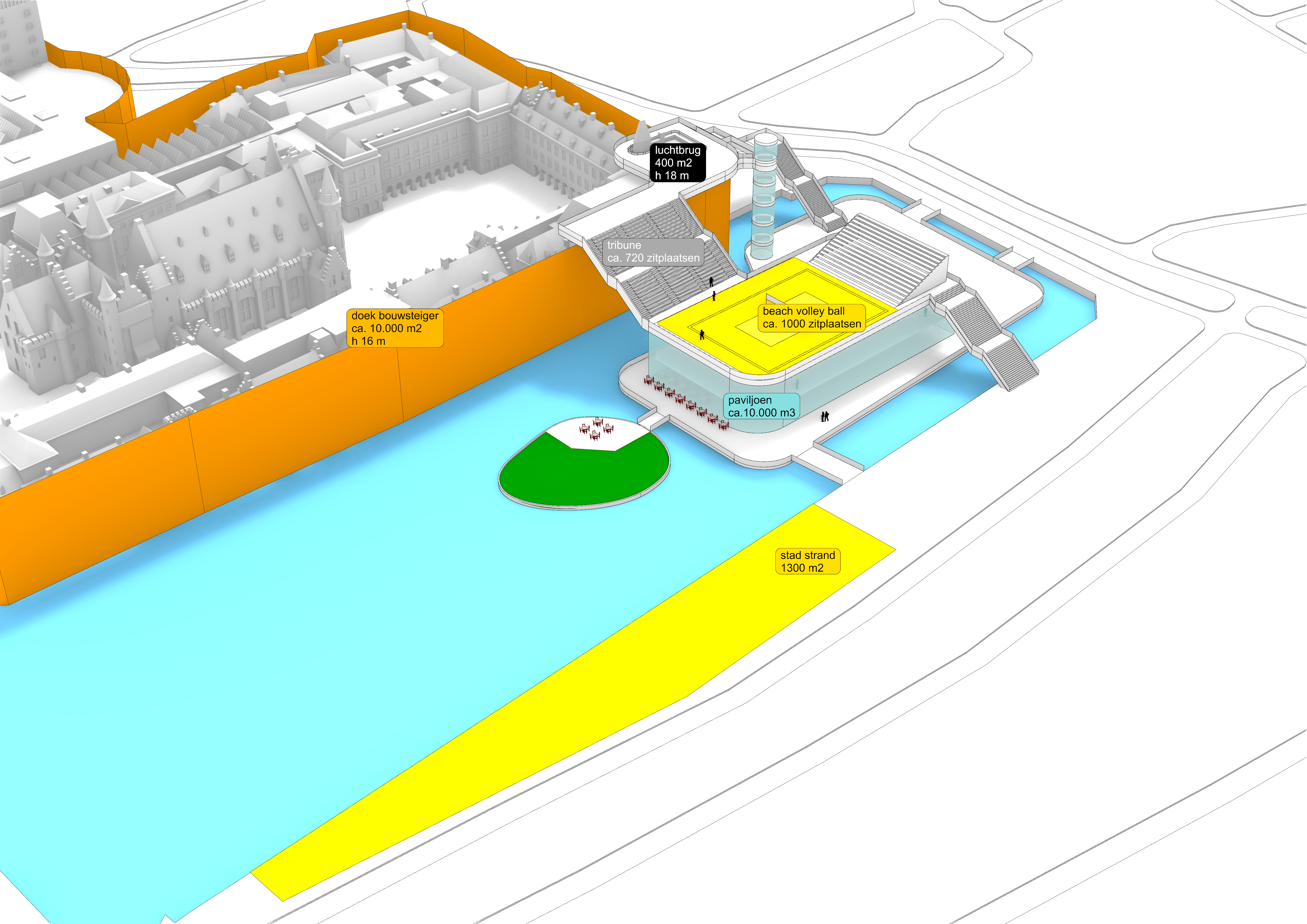 Daaromheen zit een hele set aan ingrepen die het gebied echt “aan” zetten: een brug met uitzicht over de werkzaamheden, een schaatsbaan en stadsstrand die per jaar afwisselen, een exclusief terras op het eilandje in de Hofvijver en een bouwsteiger die niet verstopt wordt, maar juist als onderdeel van het ontwerp is vormgegeven. Alles is opgezet als één herkenbare stijl, met ruimte voor city dressing in de hele binnenstad.