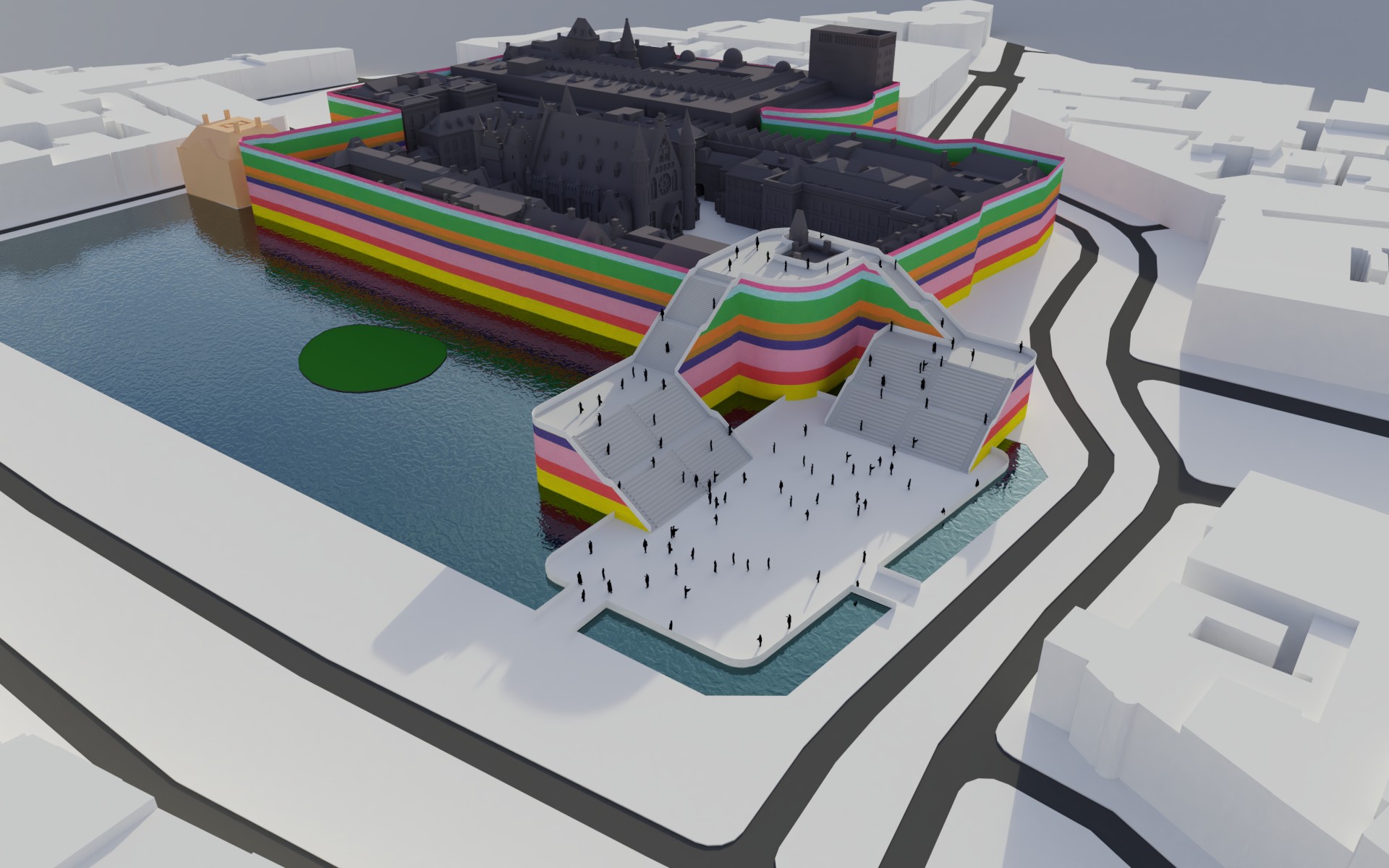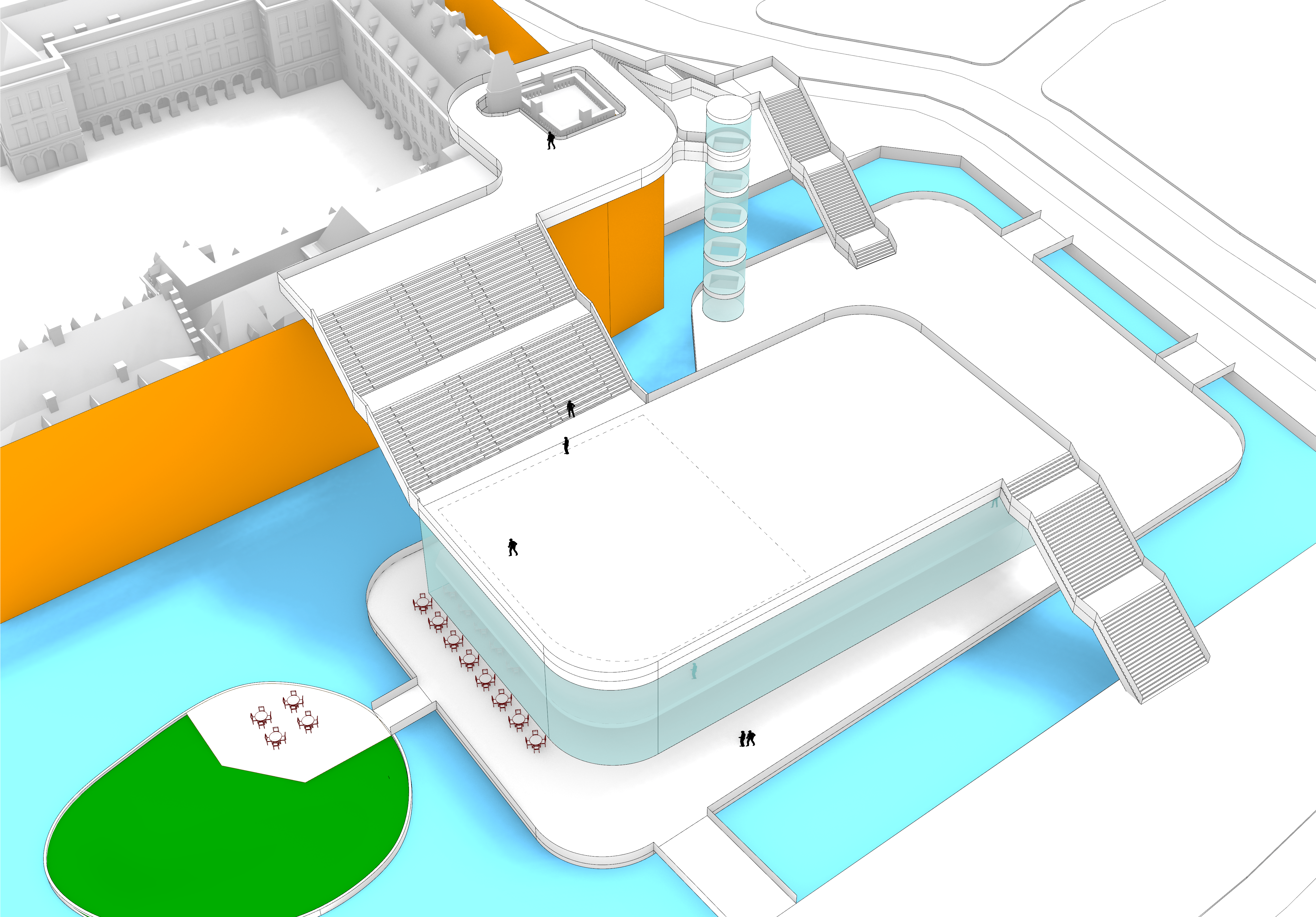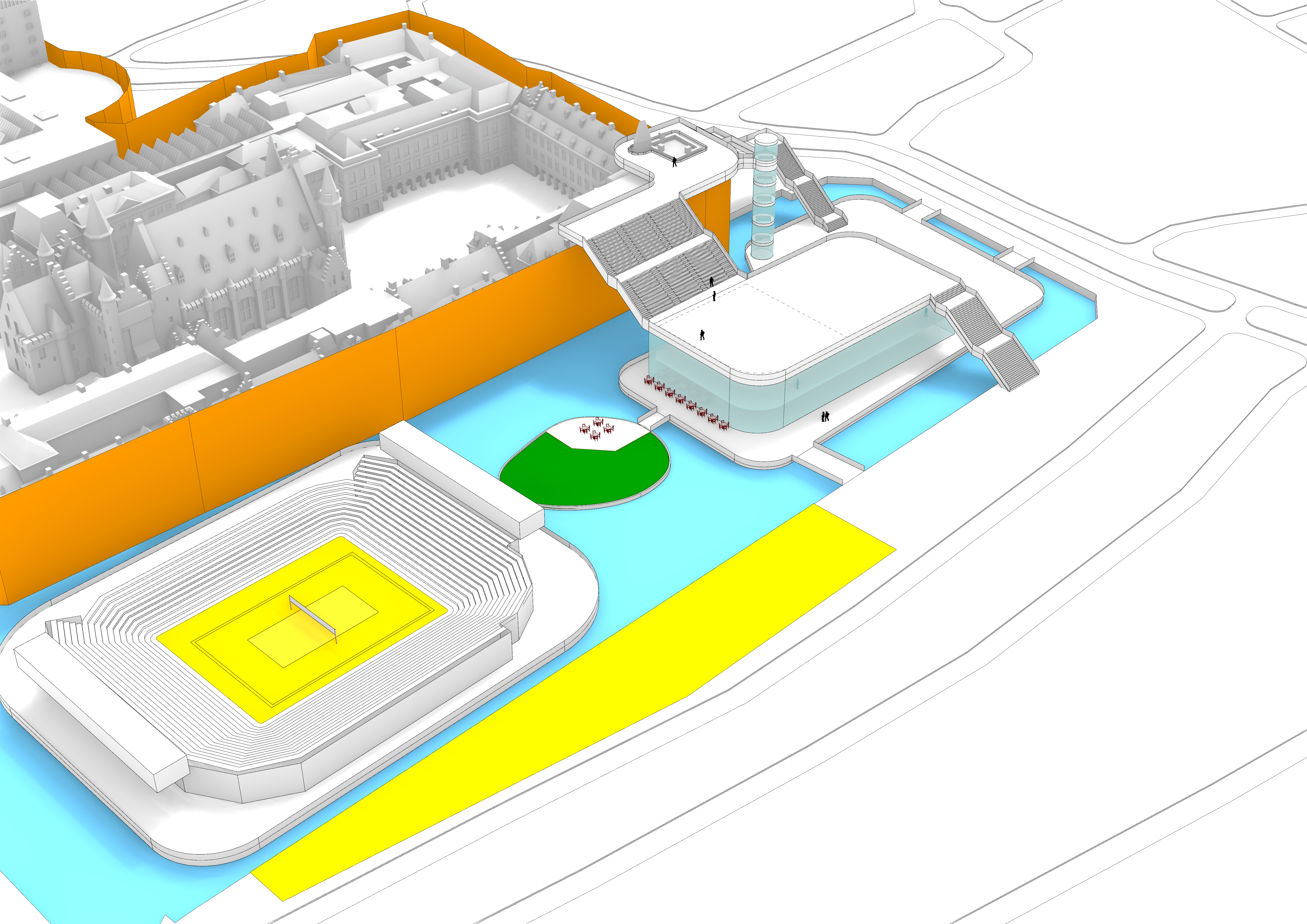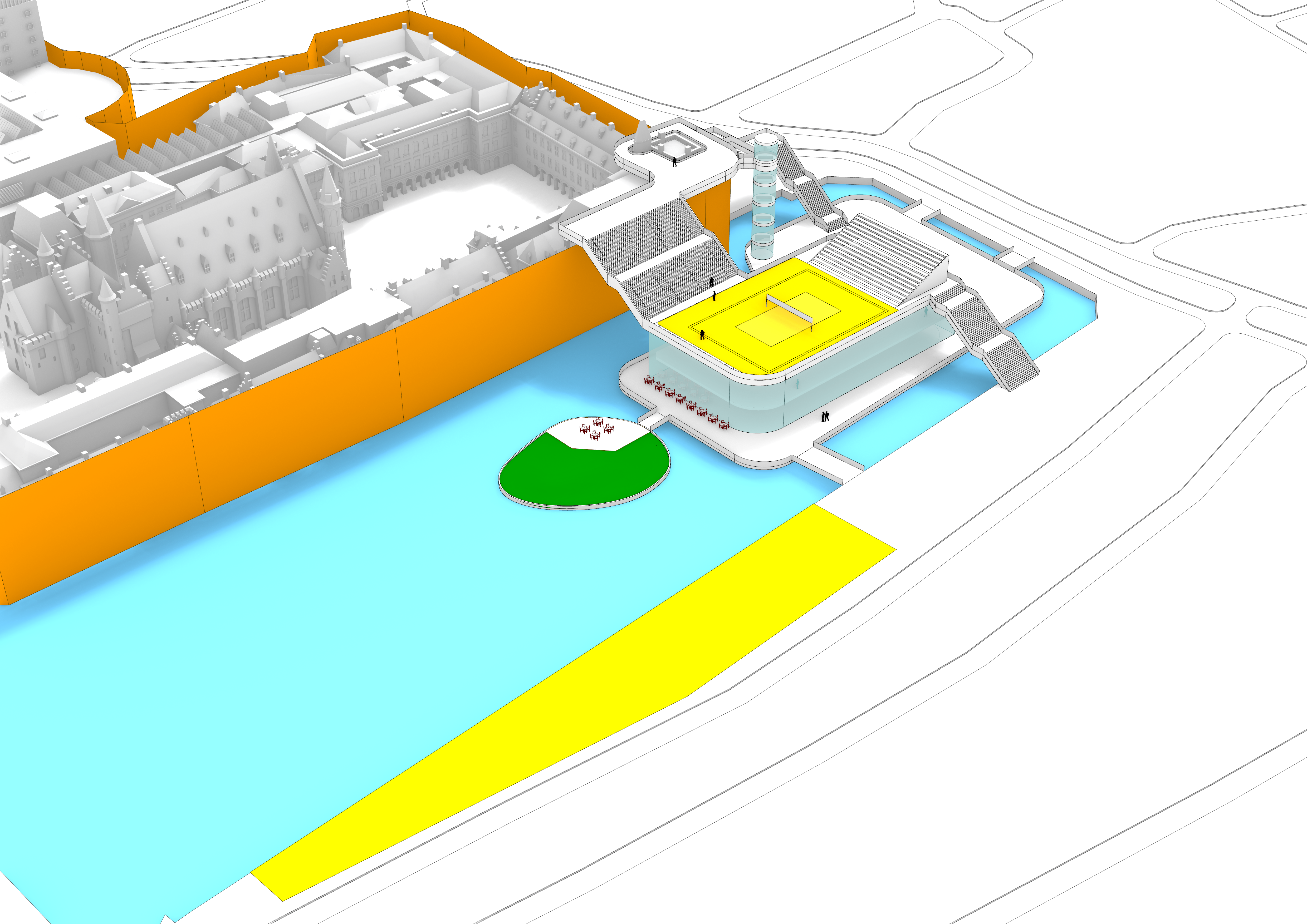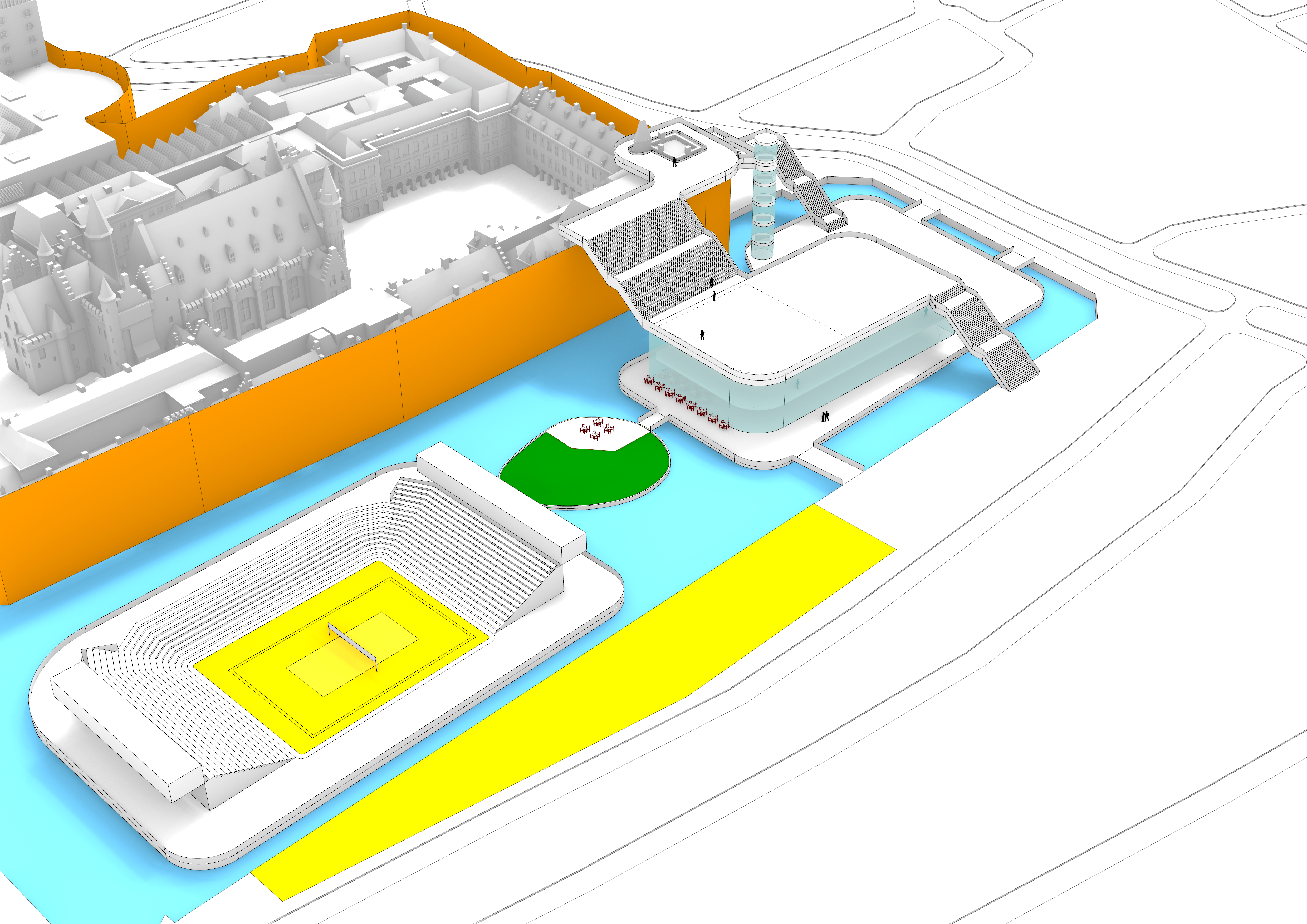 Daaromheen zit een hele set aan ingrepen die het gebied echt “aan” zetten: een brug met uitzicht over de werkzaamheden, een schaatsbaan en stadsstrand die per jaar afwisselen, een exclusief terras op het eilandje in de Hofvijver en een bouwsteiger die niet verstopt wordt, maar juist als onderdeel van het ontwerp is vormgegeven. Alles is opgezet als één herkenbare stijl, met ruimte voor city dressing in de hele binnenstad.