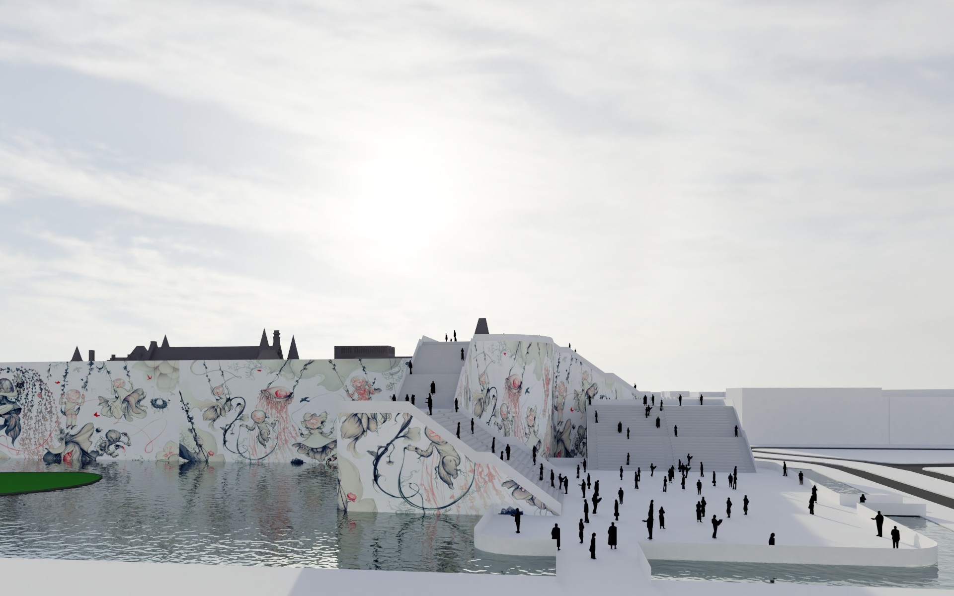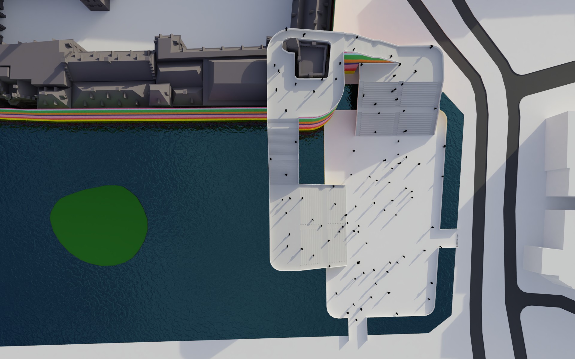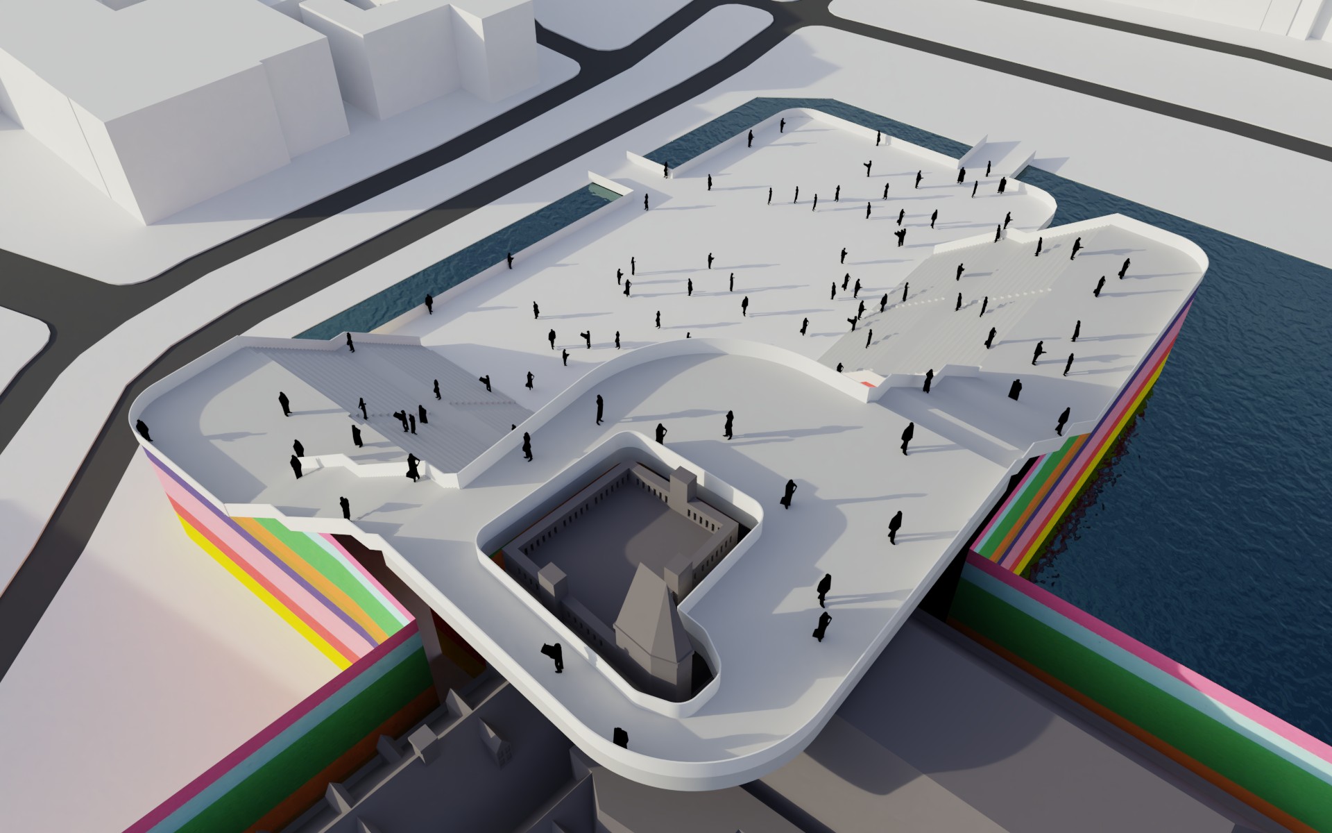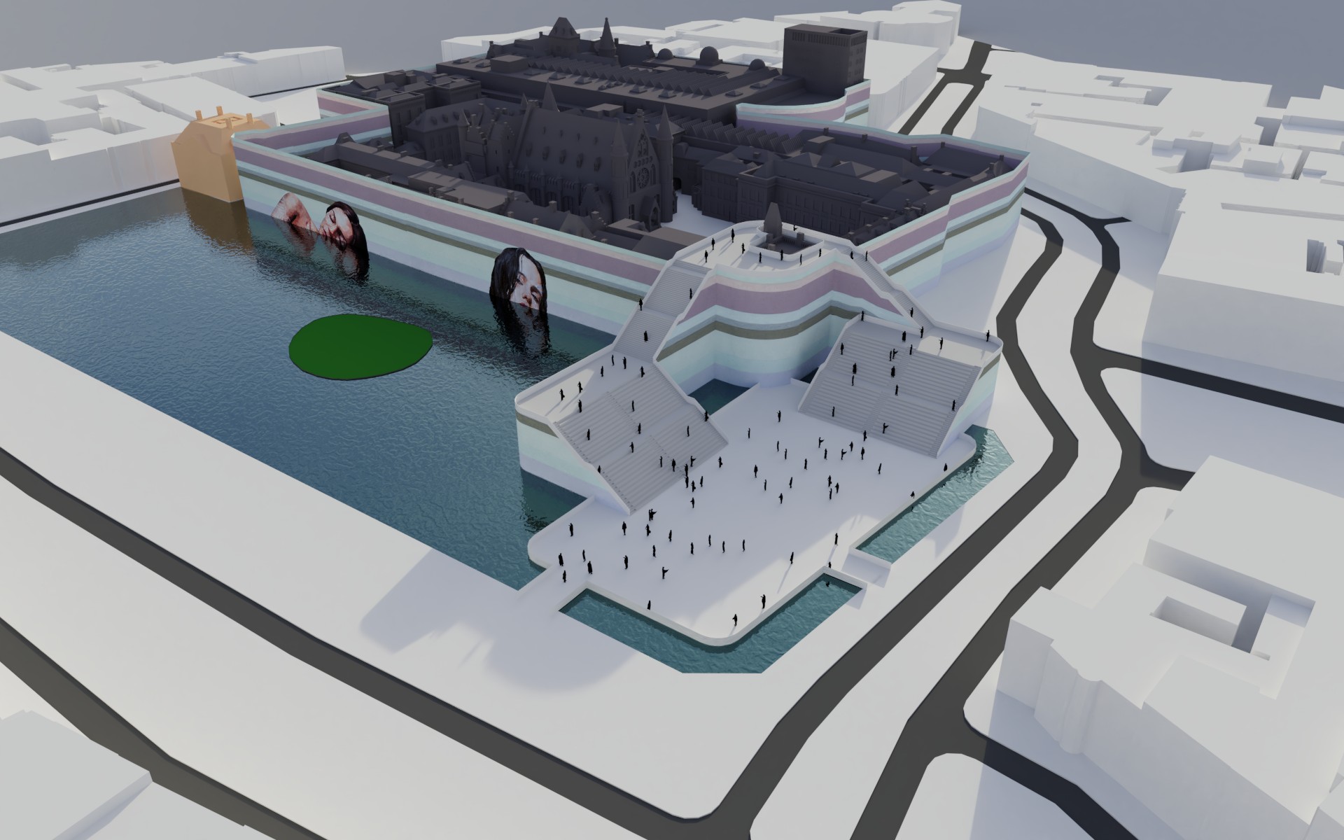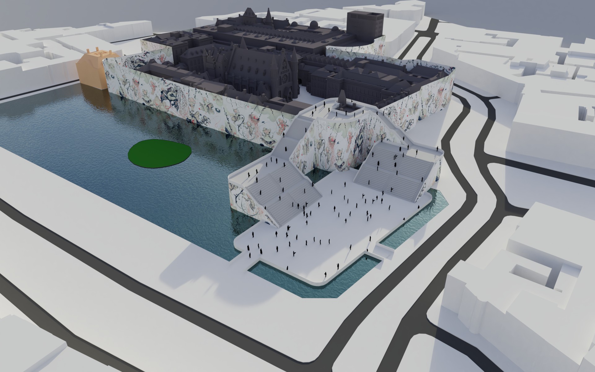 Daaromheen zit een hele set aan ingrepen die het gebied echt “aan” zetten: een brug met uitzicht over de werkzaamheden, een schaatsbaan en stadsstrand die per jaar afwisselen, een exclusief terras op het eilandje in de Hofvijver en een bouwsteiger die niet verstopt wordt, maar juist als onderdeel van het ontwerp is vormgegeven. Alles is opgezet als één herkenbare stijl, met ruimte voor city dressing in de hele binnenstad.