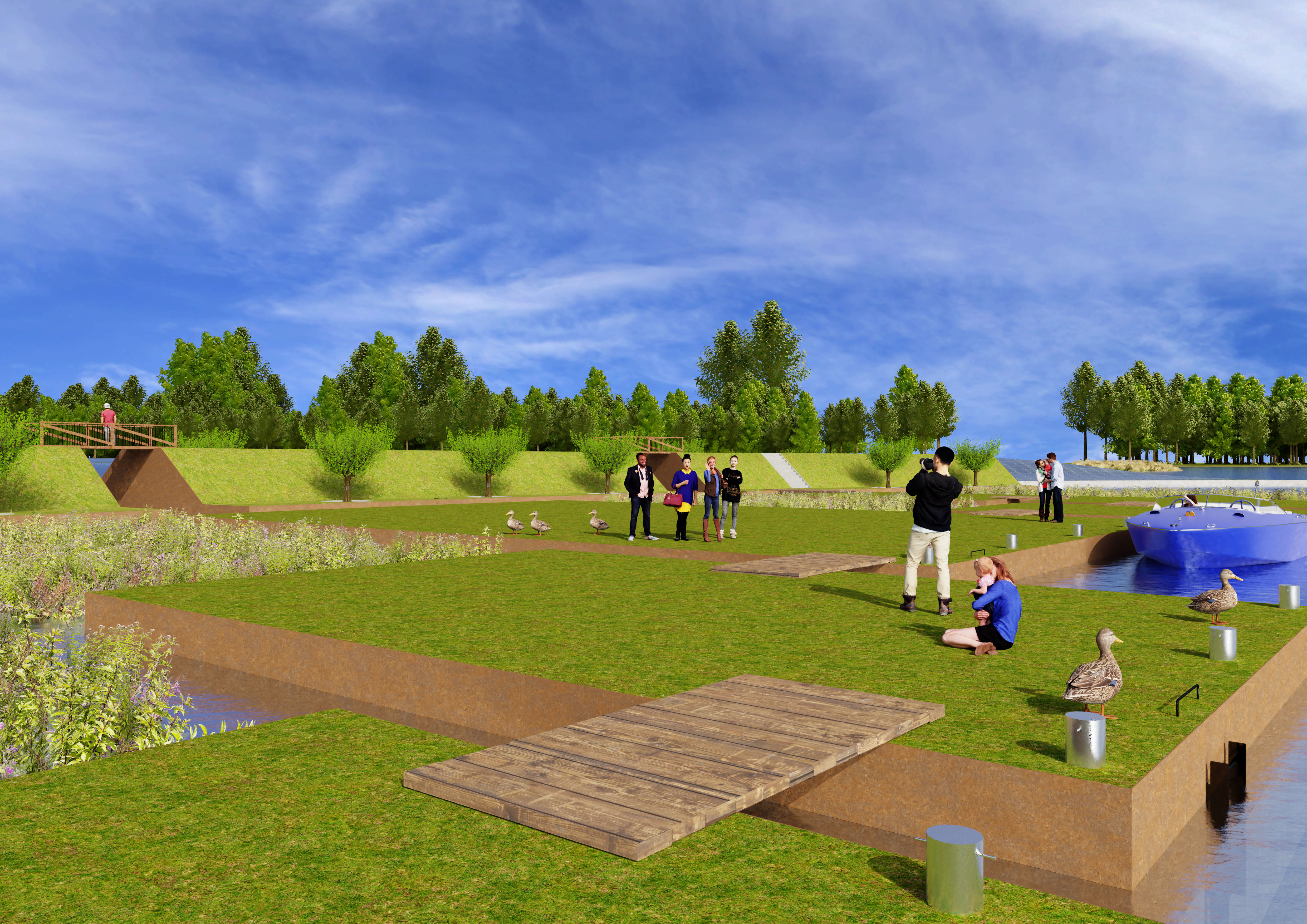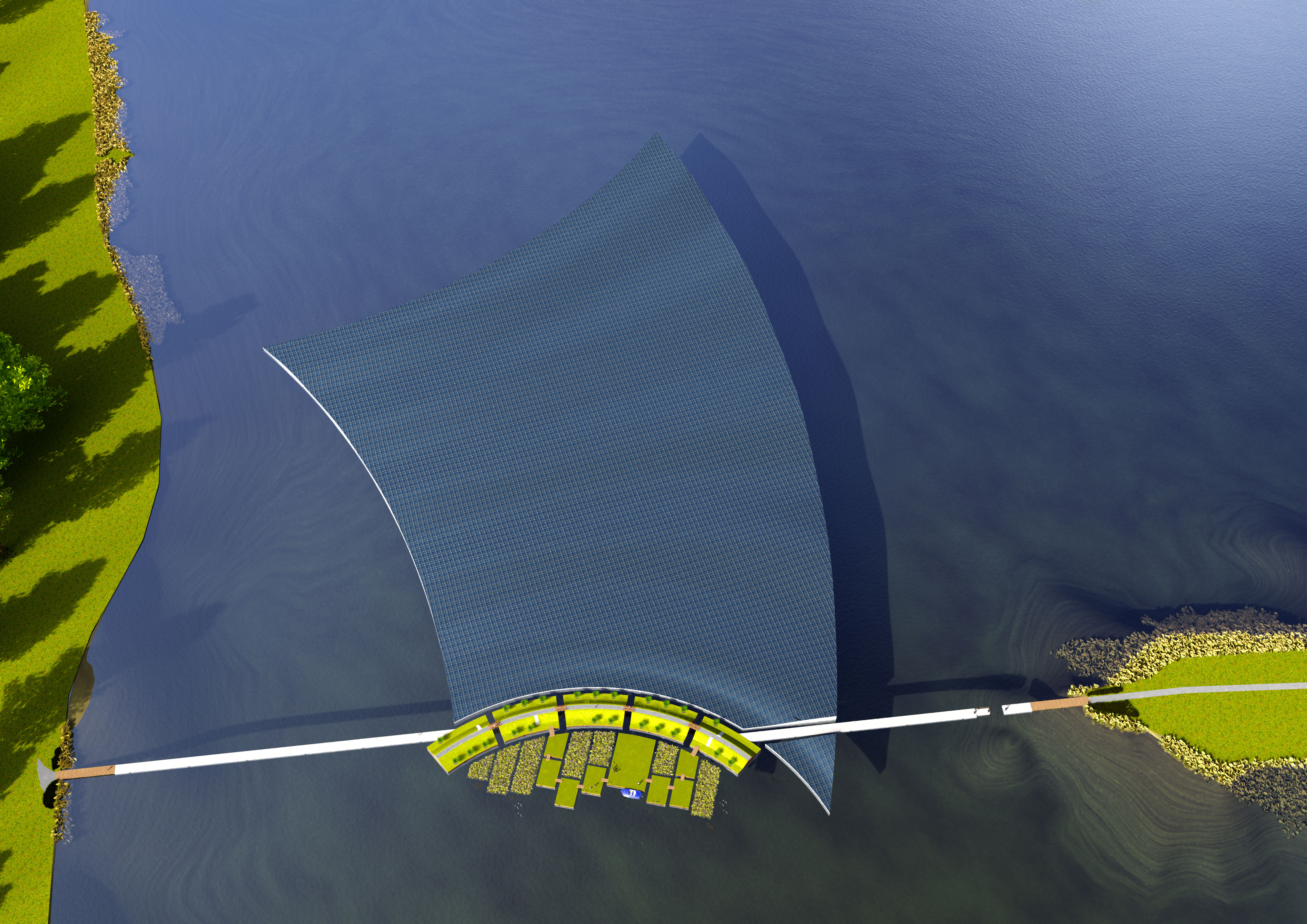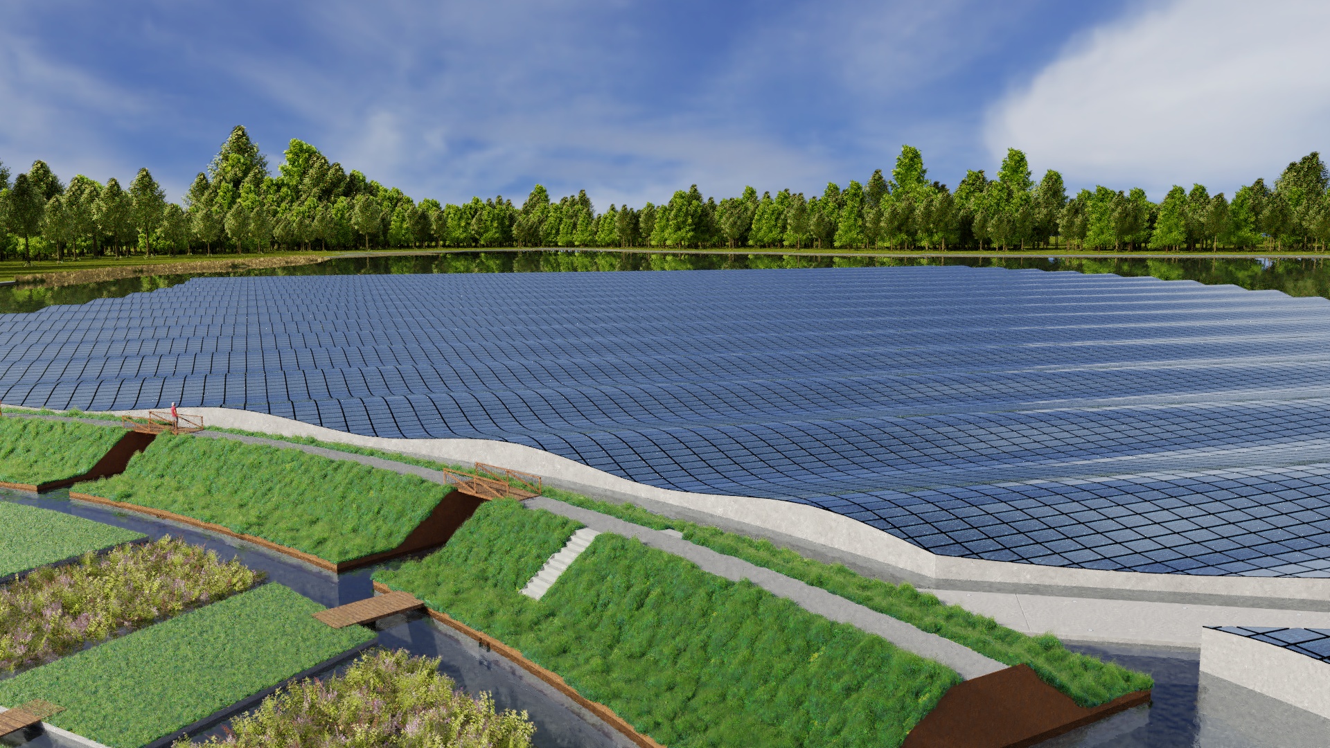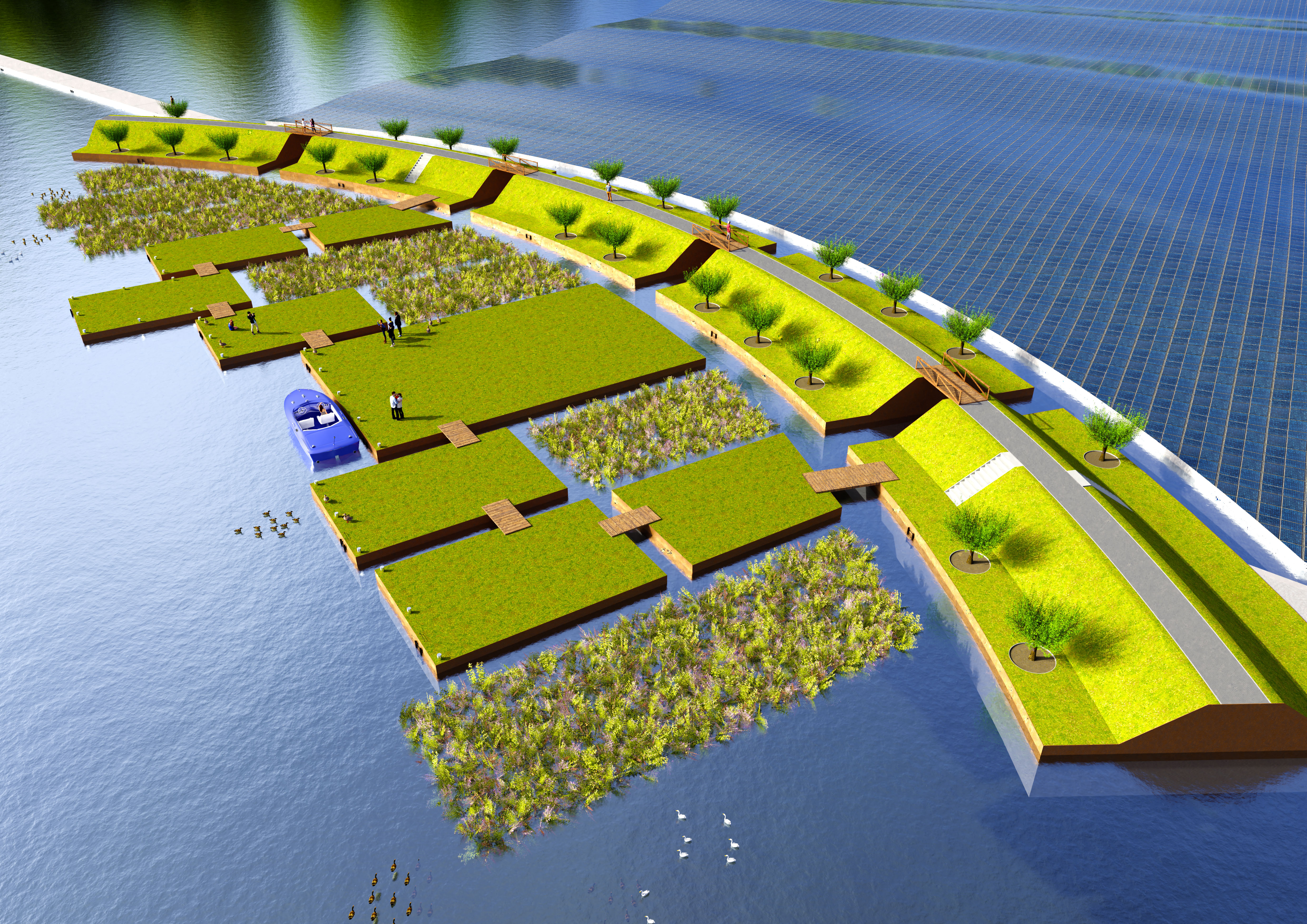 De ruggengraat van het plan is een lange, licht gebogen drijvende dijk die de oevers van de Lingemeren met elkaar verbindt. Aan de luwere kant liggen drijvende “polders” met gras, fruitbomen en bloemen. Je kunt er wandelen en fietsen, en het voelt als een groen landschap dat zacht mee beweegt met het water. Aan de andere kant ligt een golvend zonneveld van vijf hectare dat energie opwekt en tegelijk een sterk beeld neerzet in het meer.