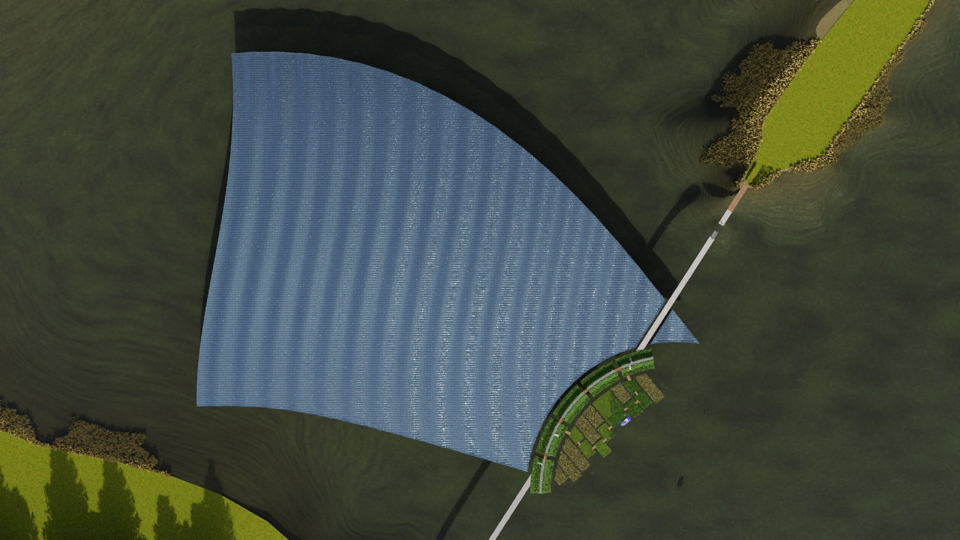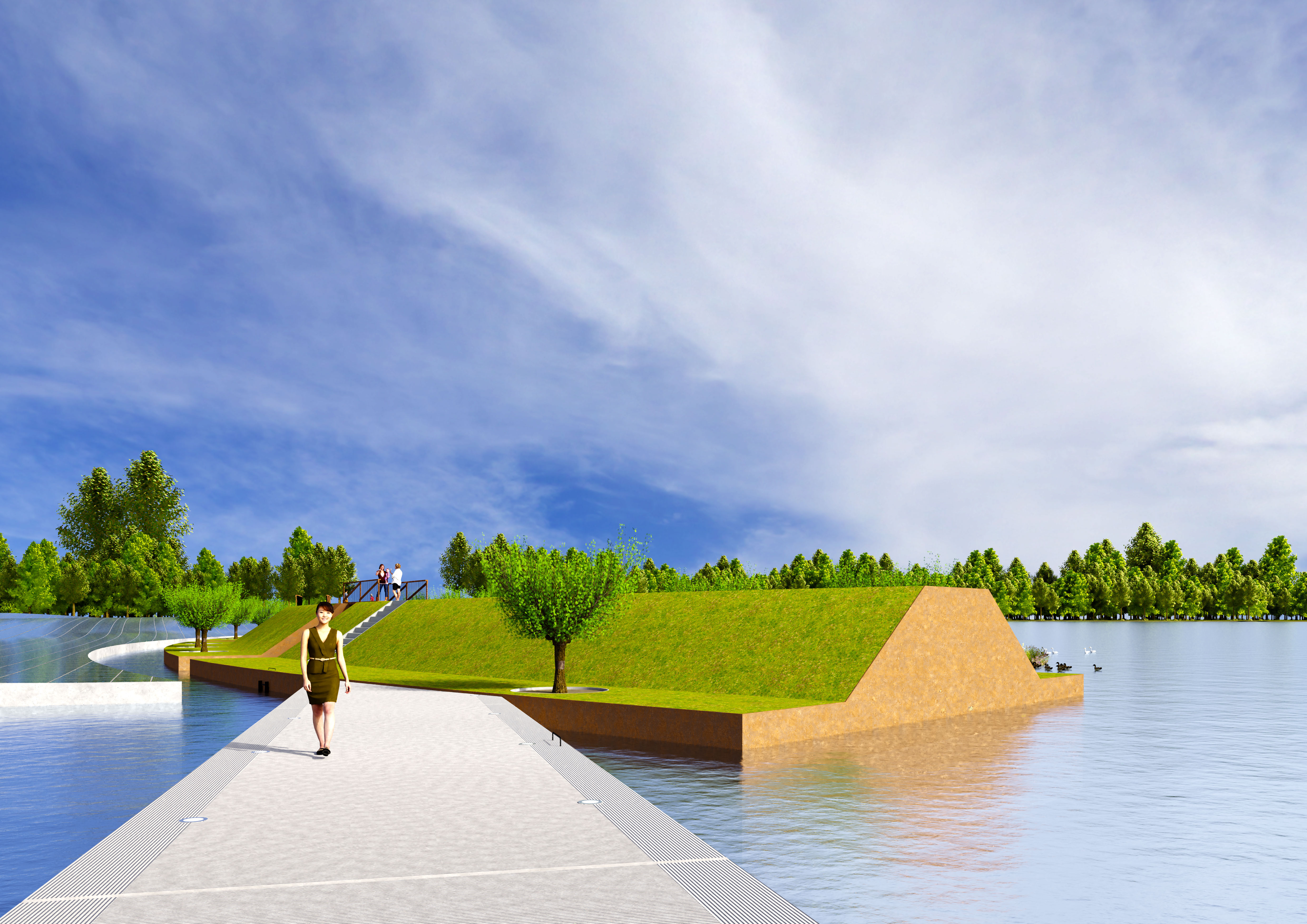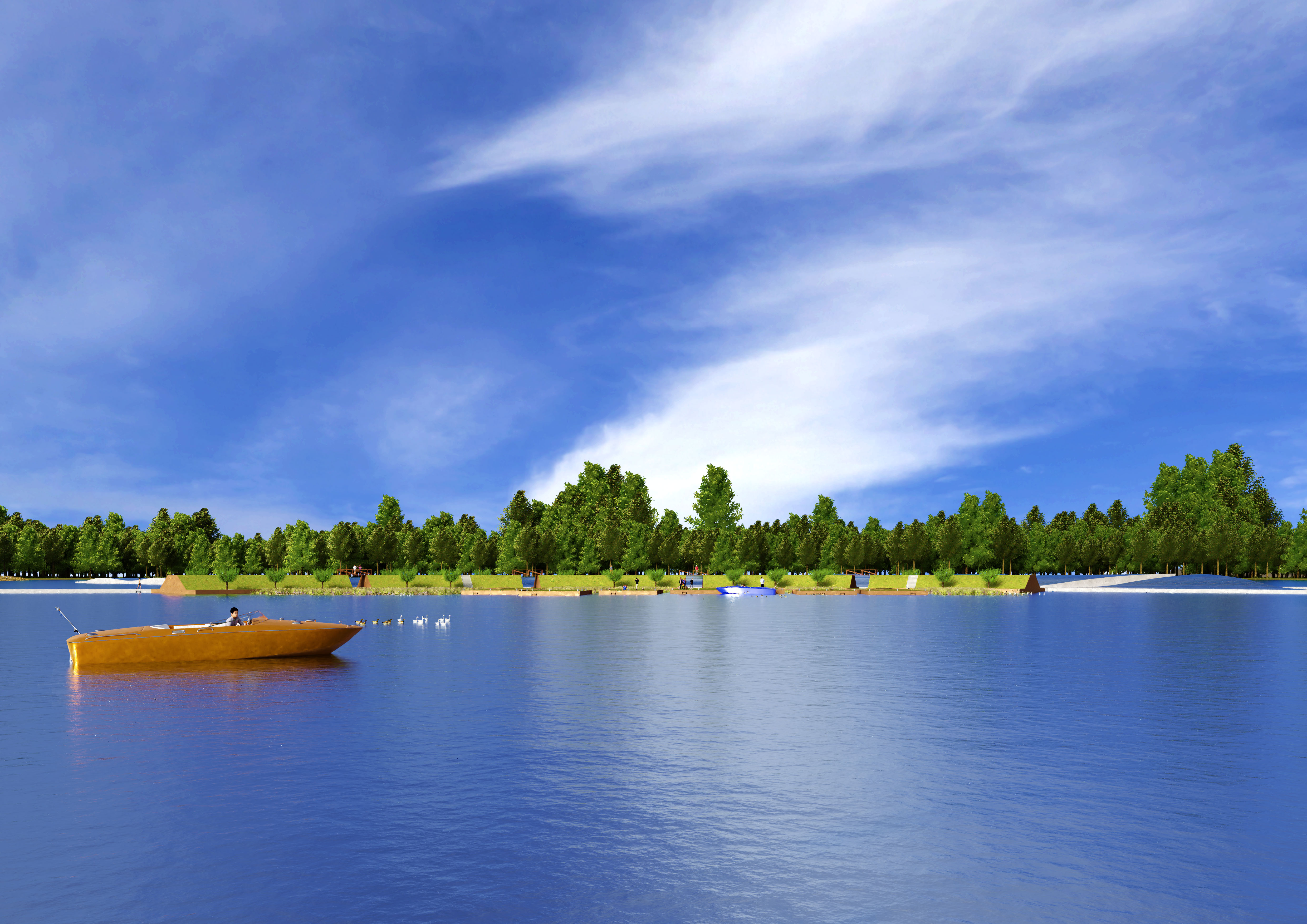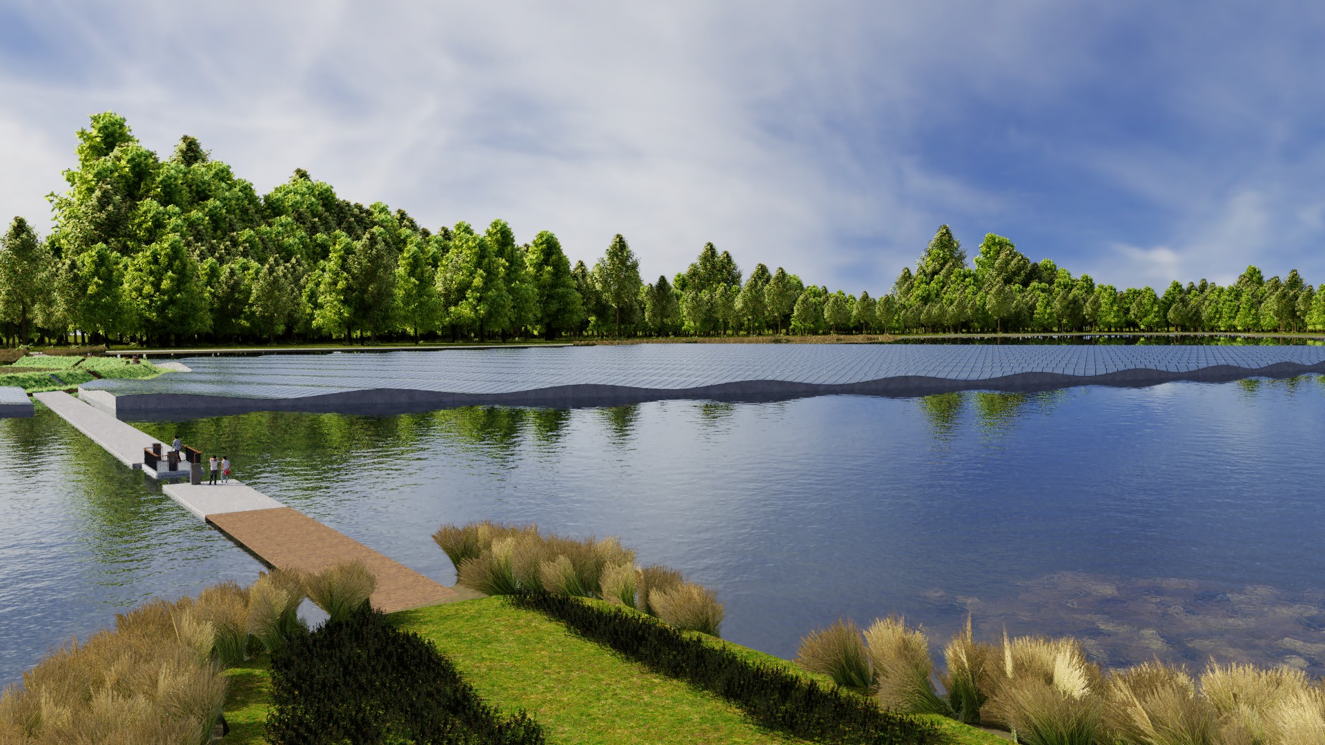 De ruggengraat van het plan is een lange, licht gebogen drijvende dijk die de oevers van de Lingemeren met elkaar verbindt. Aan de luwere kant liggen drijvende “polders” met gras, fruitbomen en bloemen. Je kunt er wandelen en fietsen, en het voelt als een groen landschap dat zacht mee beweegt met het water. Aan de andere kant ligt een golvend zonneveld van vijf hectare dat energie opwekt en tegelijk een sterk beeld neerzet in het meer.