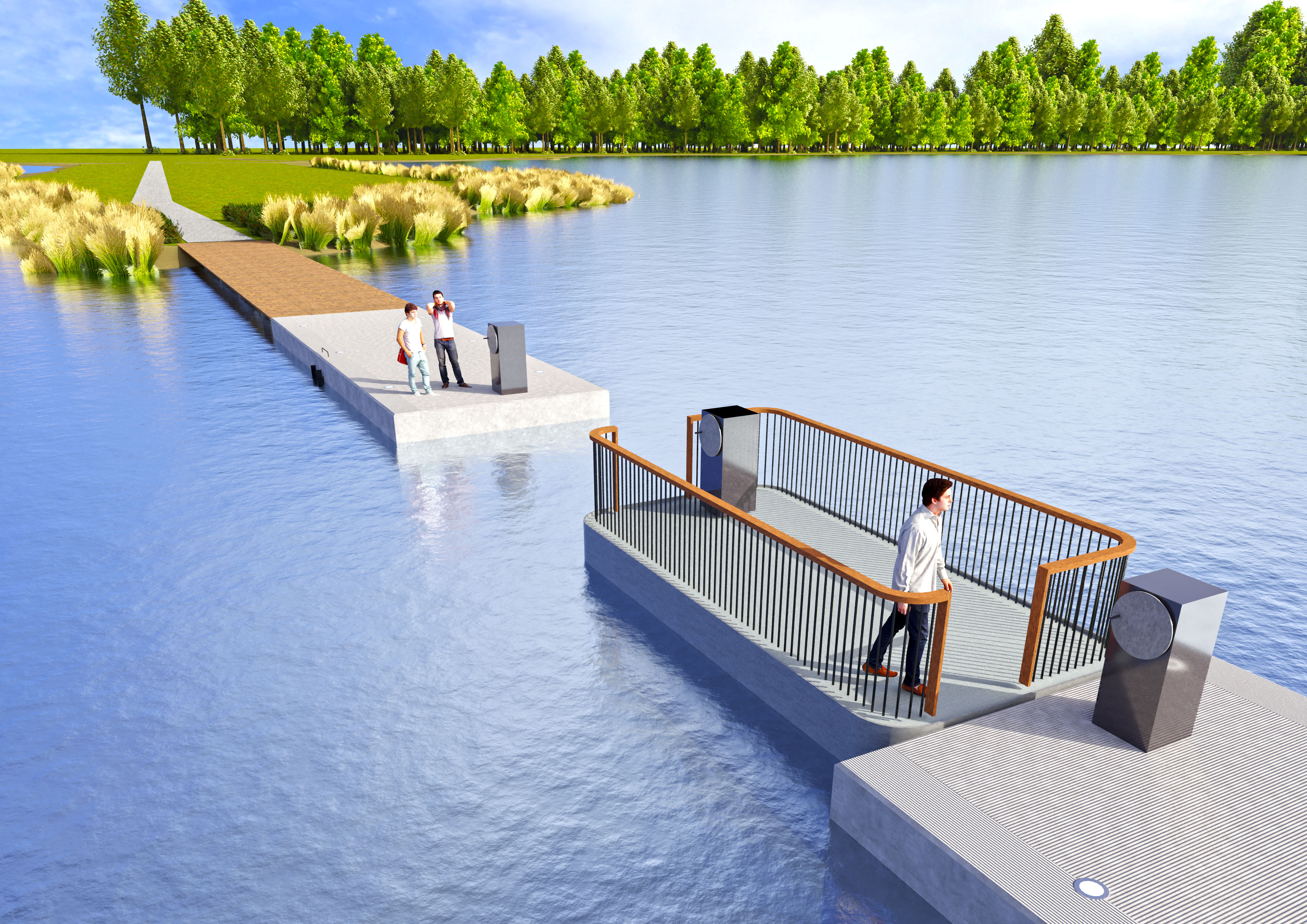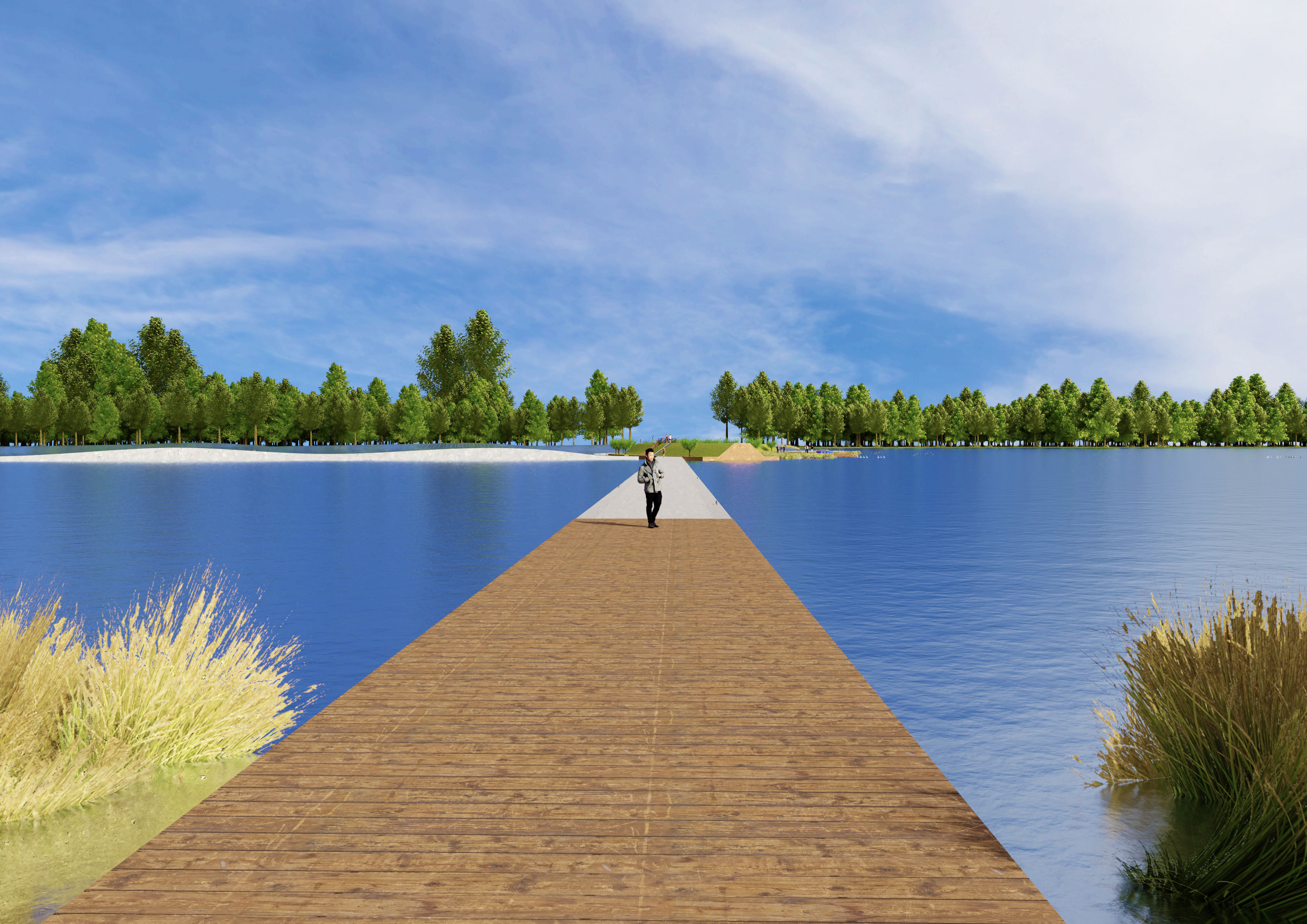 Het drijven is hier geen abstract idee, maar iets wat je letterlijk merkt. De kleine bewegingen van het water voel je direct als je over de dijk loopt. Zo ontstaat niet alleen een verbinding in het landschap, maar ook een zintuiglijke ervaring. De dijk blijft bovendien deels doorvaarbaar, zodat boten en recreatievaart hun route door het meer kunnen blijven maken.